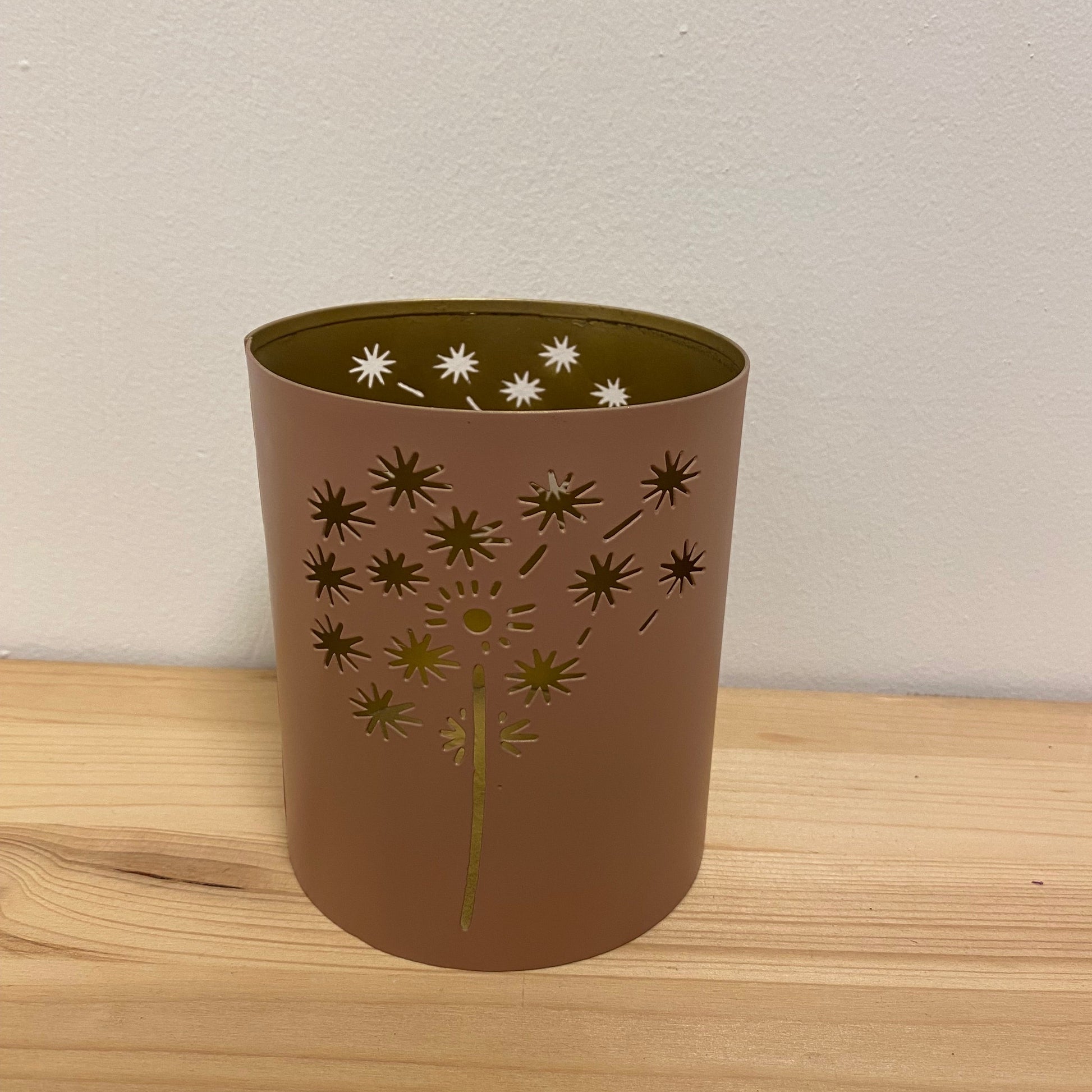 Een stoere waxinehouder goud met zacht / mat roze, aan de binnenkant brand deze extra leuk. het weerkaats de licht van de kaars.
